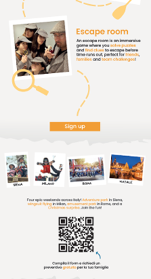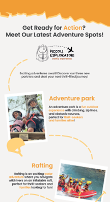 Voor de eerste opdrachten moeten Staf en ik allerlei verschillende dingen designen/ vormgeven voor het bedrijf Piccoli Esploratori. Voor de eerste opdracht moest ik een social media post designen voor 3 nieuwe activiteiten uit te leggen: Adventure park, Rafting en Escape room.