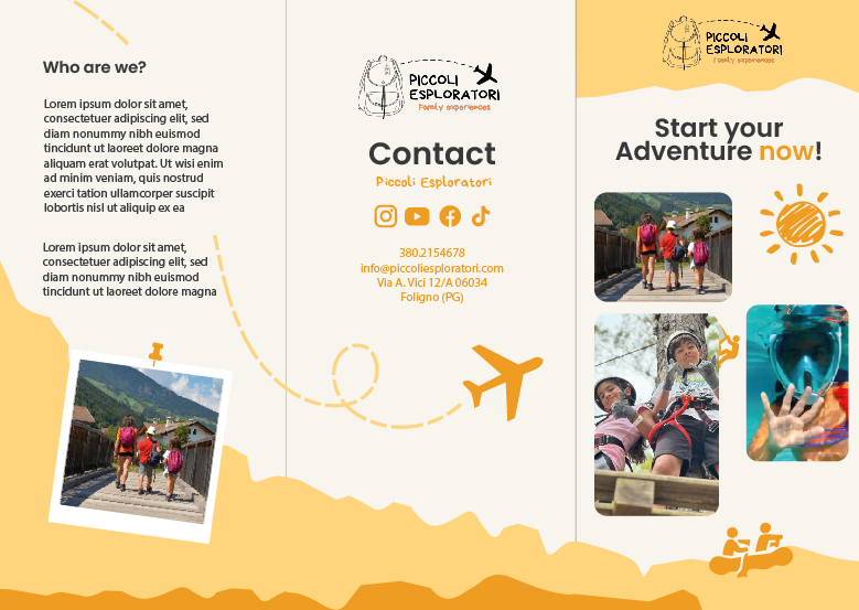Ik moest een brochure maken voor Piccoli Esploratori, deze opdracht vond ik eerlijk gezegt niet echt iets voor mij. Ik kreeg weinig info over wat er in moest staan, dus het ging niet zo goed vooruit.. Ik denk ook dat mijn stagementor dit door had dus heeft hij mij in week 4 iets anders gegeven. De brochure moest vooral de mensen aantrekken en aanmoedigen om bij Piccoli Esploratori een activiteit/ avontuur te gaan volgen.